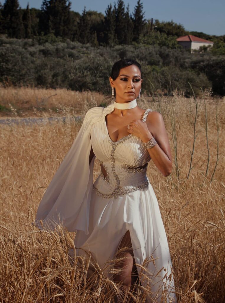 فيما بدت الممثلة برناديت حديب كأميرة بيضاء بإطلالة ساحرة بفستان أبيض مطرّز بتفاصيل فضّية، مستوحى من الطراز الإغريقي، مع كاب أنيق أضفى عليها رونقًا خاصًا في ساحة المهرجان.